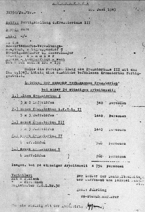 The perfection, the culminating achievements of the technical perfection of gas chambers, were the fixed gas chambers in the death camps which pretended to be shower rooms. Out of the ceiling, instead of water comes the Zyklon gas. Next to the five gas chambers in Auschwitz there are five crematoria that dispose of the bodies. Given an hour or two there is nothing left except dust. At the rate between nine and ten thousand a day, day in, day out. At that rate they managed to kill in Auschwitz alone, Auschwitz Birkenau , (the two adjoining camps) 1.6 million people with their five gas chambers.