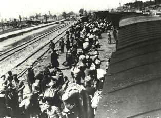 We are now at the last stage. All I can do is keep on apologizing to you. This is the establishment of the death camps. Some of you maybe have even visited Auschwitz, a prototype of the death camps. The railway line leads into the camp, but it doesn’t come out the other side. On arrival a selection takes place. Those males who are considered capable of performing slave labour for a certain time until they were worked to death, are separated from women and children and the sick who will go to their death on arrival.