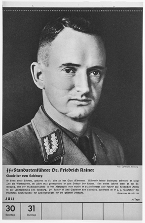 His administrative abilities were recognised in September when he was appointed Reich Defence Commissioner for Military District XVIII. Then in the spring of 1940 when the Ostmark Law reorganised the earlier provinces of Austria into seven Reichsgaue, Rainer was named Governor of Salzburg.