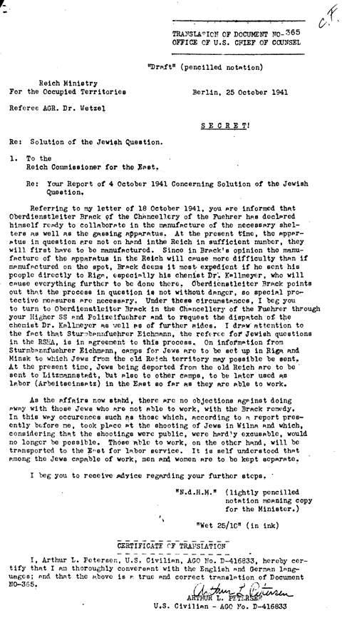 “Herr Viktor Brack Oberdienstleiter in the Fuhrer’s Chancellery, is ready to collaborate in the installation of the necessary buildings and gas plants. He thinks it easier to construct the latter, of which we are short, on the spot.