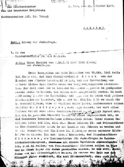 Dr Erhard Wetzel wrote from Rosenberg’s office on the 25 October 1941 to Reichskommissar Lohse in Riga:
