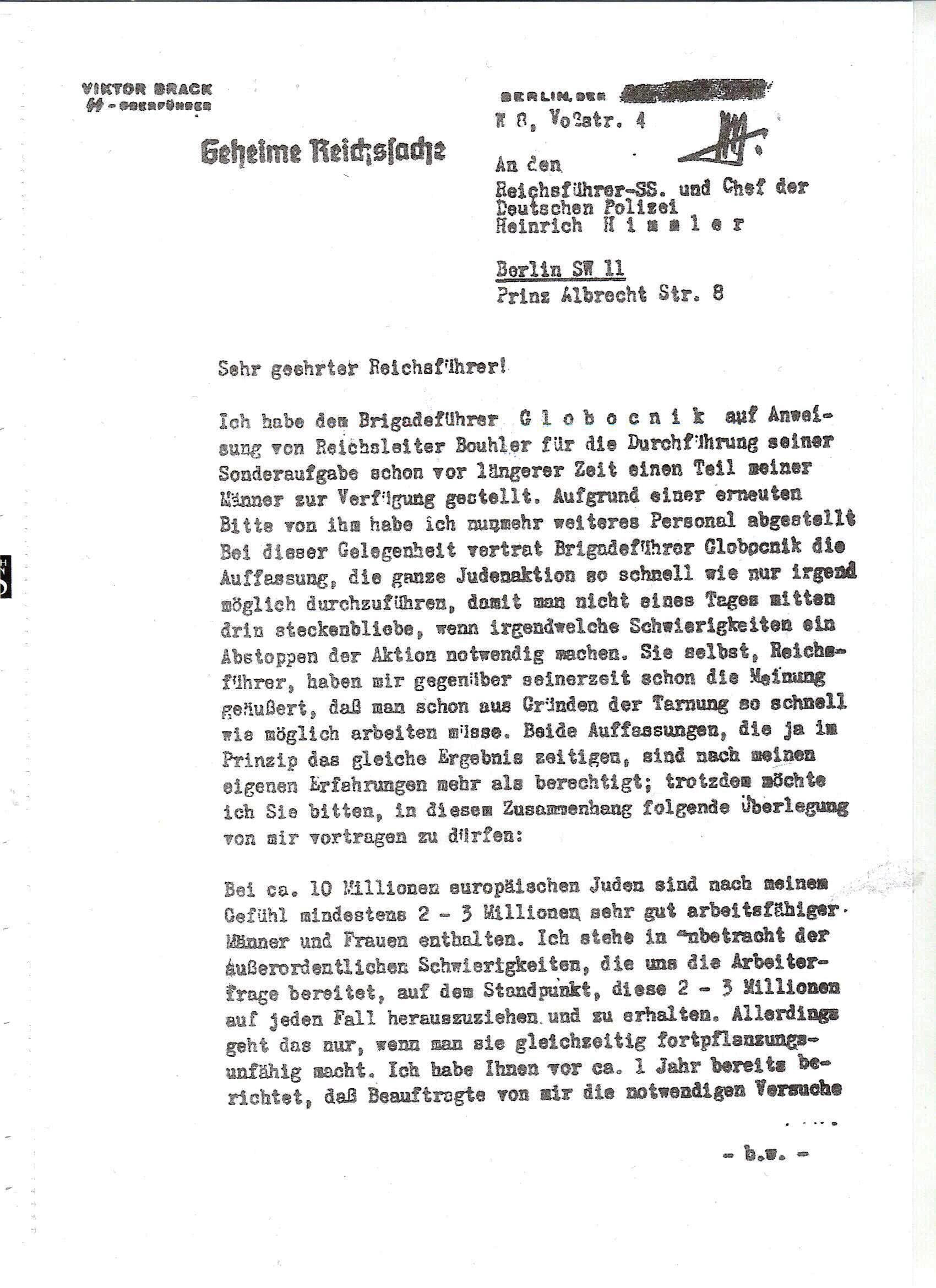 After this meeting with Globocnik, Viktor Brack wrote to Heinrich Himmler on the 23 June 1942: