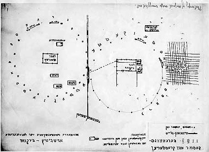 Behind the town stood a clothing factory called the "Bekleindungswerke." In the courtyard waiting for their noon meal some 1,000 prisoners in dirty striped clothing, obviously Jews, were lined up and the sight of them was none too encouraging. Arriving on a small hill we suddenly sighted the vast barrack camp of MAJDANEK surrounded by a 3-meter-high barbed wire fence.