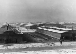 We were billeted in "Block 17" and slept on the floor. In an adjoining row of buildings separated from ours by a high wall, the Jewish girls from Slovakia, who had been brought there in March and April of 1942 were quartered. We worked in the huge "BUNA" plant to which we were herded every morning about 3 a.m. At midday our food consisted of potato or turnip soup and in the evening we received some bread. During work we were terribly mistreated. As our working place was situated outside the large chain of sentry posts, it was divided into small sectors of 10 x 10 meters, each guarded by an SS man, Whoever stepped outside these squares during working hours was immediately shot without warning for having "attempted to escape." Often it happened that out of pure spite an SS man would order a prisoner to fetch some given object outside his square. If he followed the order, he was shot for having left his assigned place.